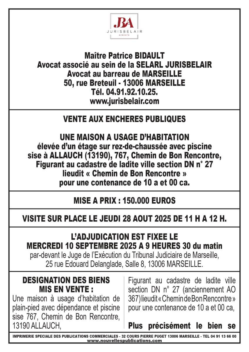 VENTE AUX ENCHERES PUBLIQUES UNE MAISON A USAGE D’HABITATION élevée d’un étage sur rez-de-chaussée avec piscine sise à ALLAUCH (13190), 767, Chemin de Bon Rencontre, Figurant au cadastre de ladite ville section DN n° 27 lieudit « Chemin de Bon Rencontre » pour une contenance de 10 a et 00 ca.