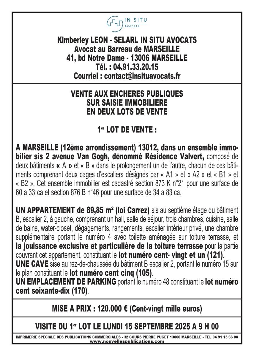 1ER LOT mise à prix 120 000€ VENTE AUX ENCHERES PUBLIQUES SUR SAISIE IMMOBILIERE EN DEUX LOTS DE VENTE 1er LOT DE VENTE : A MARSEILLE (12ème arrondissement) 13012, dans un ensemble immobilier sis 2 avenue Van Gogh, dénommé Résidence Valvert, composé de deux bâtiments « A » et « B » dans le prolongement un de l’autre, chacun de ces bâtiments comprenant deux cages d’escaliers désignés par « A1 » et « A2 » et « B1 » et « B2 ». Cet ensemble immobilier est cadastré section 873 K n°21 pour une surface de 60 a 33 ca et section 876 B n°46 pour une surface de 34 a 83 ca, UN APPARTEMENT de 89,85 m² (loi Carrez) sis au septième étage du bâtiment B, escalier 2, à gauche, comprenant un hall, salle de séjour, trois chambres, cuisine, salle de bains, water-closet, dégagements, rangements, escalier intérieur privé, une chambre supplémentaire portant le numéro 4 avec toilette aménagée sur toiture terrasse, et la jouissance exclusive et particulière de la toiture terrasse pour la partie couvrant cet appartement, constituant le lot numéro cent- vingt et un (121). UNE CAVE sise au rez-de-chaussée du bâtiment B escalier 2, portant le numéro 15 sur le plan constituant le lot numéro cent cinq (105). UN EMPLACEMENT DE PARKING portant le numéro 48 constituant le lot numéro cent soixante-dix (170). 2ème lot mise à prix 100 000€ 2ème LOT DE VENTE : A MARSEILLE (12ème arrondissement) 13012, dans un ensemble immobilier en copropriété sis 14 et 16, Avenue Norma, consistant en trois bâtiments contigus dénommés A, B et C, cadastré dite commune Quartier Montolivet – Section 874 O n°123 pour 26 ares 60 centiares, UN APPARTEMENT de 50,87 m² (loi CARREZ) sis au premier étage à gauche du bâtiment « B », composé de : hall, séjour, une chambre, cuisine, salle de bains, water-closet et cellier incorporé constituant le lot numéro cinquante (50).