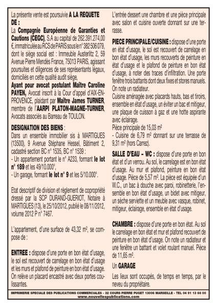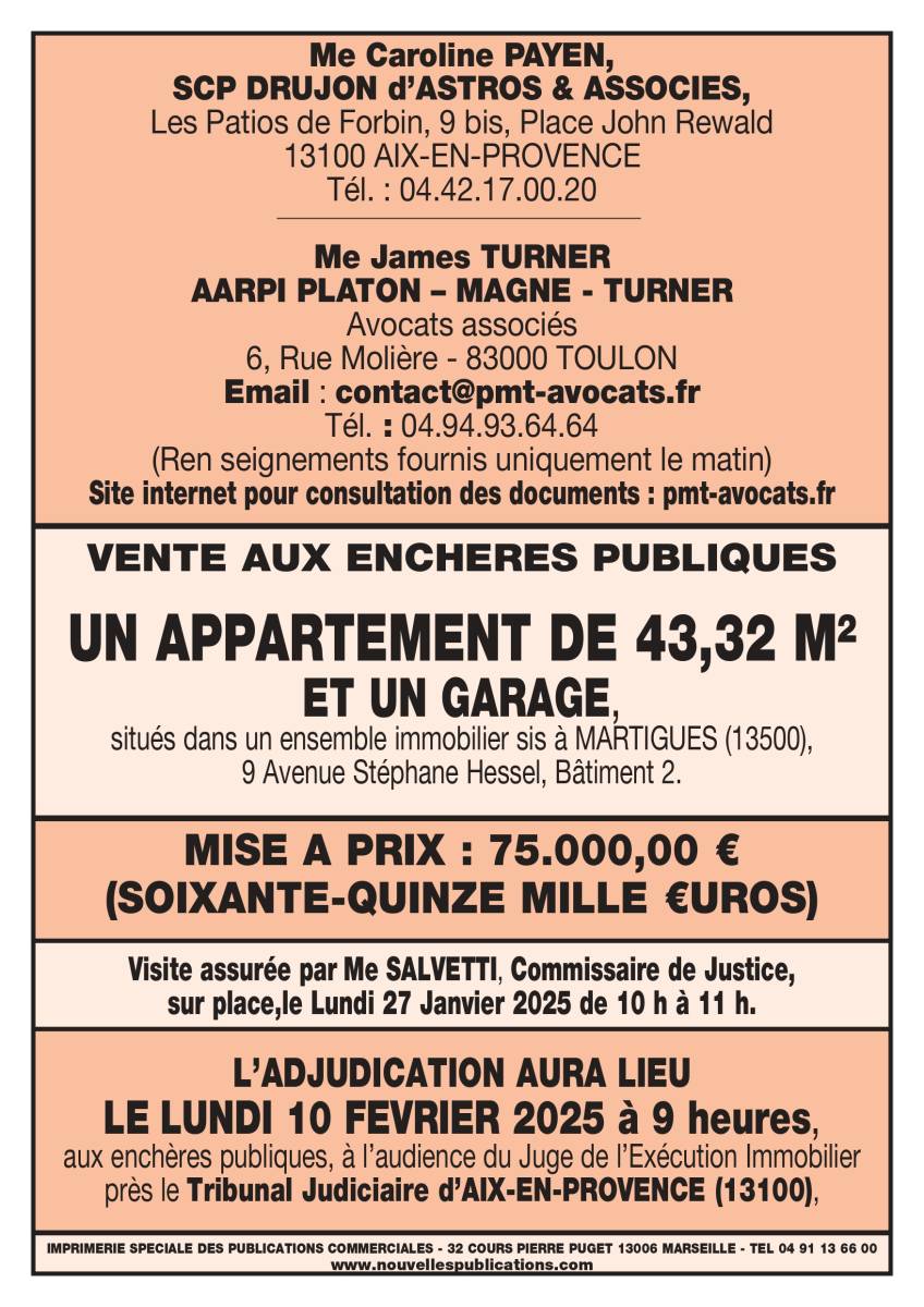 VENTE AUX ENCHERES DU 10/02/2025 APPARTEMENT MARTIGUES 13500