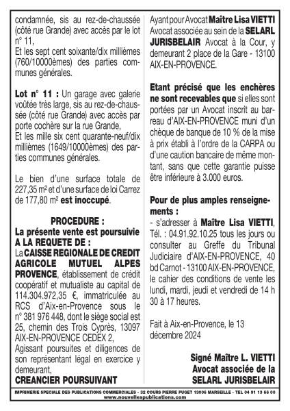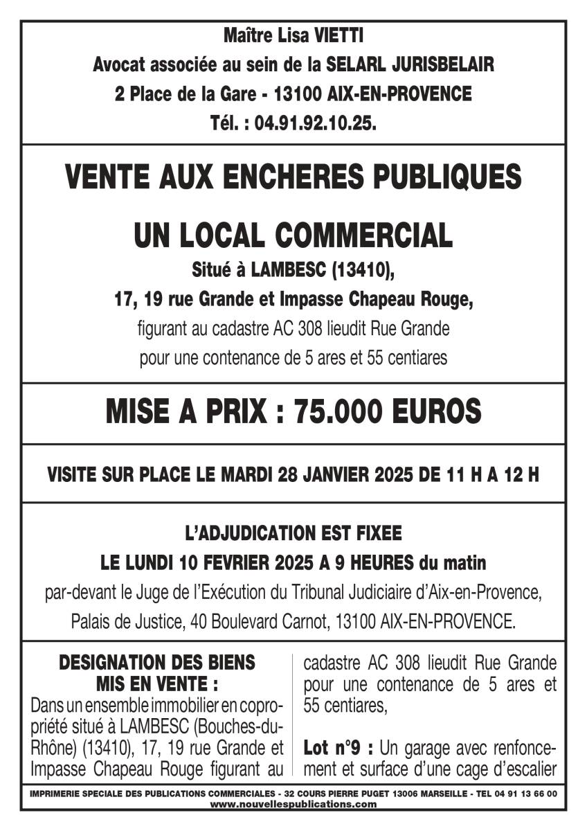 VENTE AUX ENCHERES DU 10/02/2025 LOCAL COMMERCIAL LAMBESC