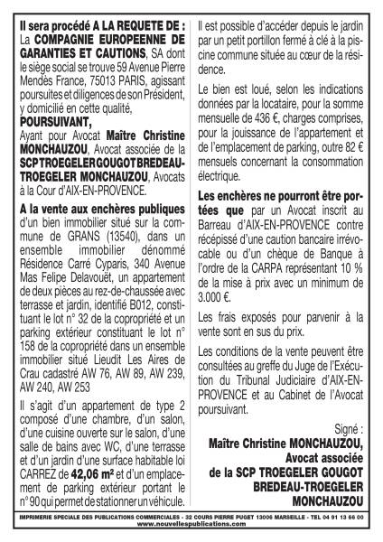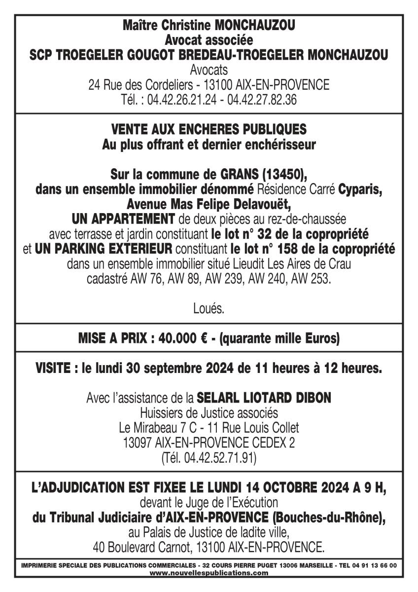 et UN PARKING EXTERIEUR constituant le lot n° 158 de la copropriété