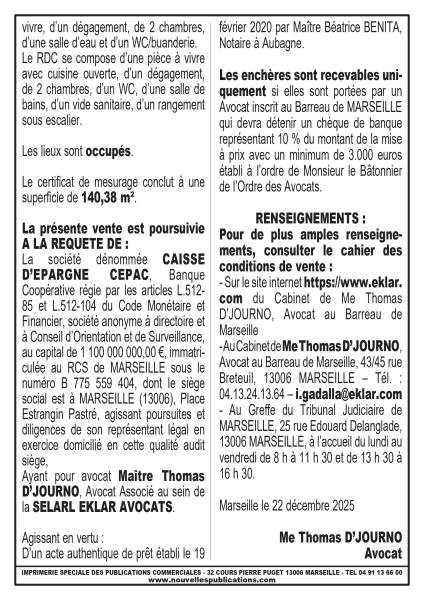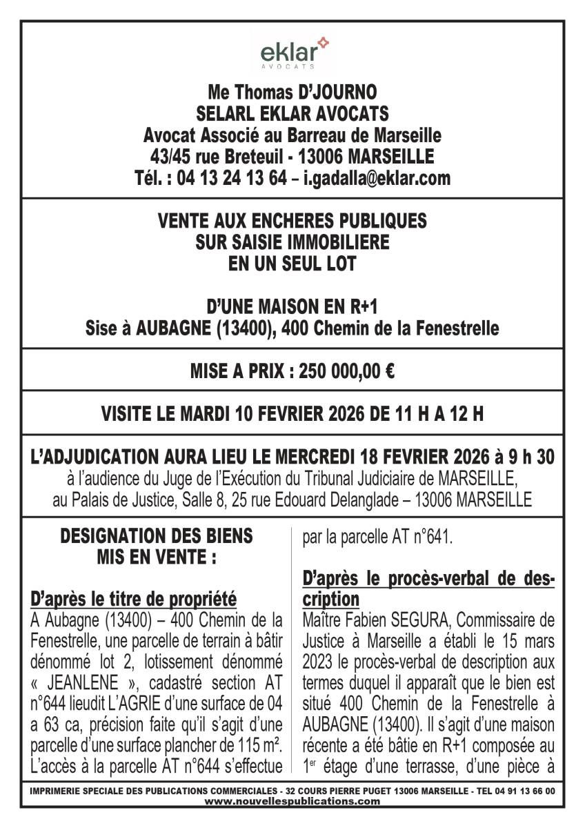 VENTE AUX ENCHERES PUBLIQUESSUR SAISIE IMMOBILIEREEN UN SEUL LOTD’UNE MAISON EN R+1Sise à AUBAGNE (13400), 400 Chemin de la Fenestrelle