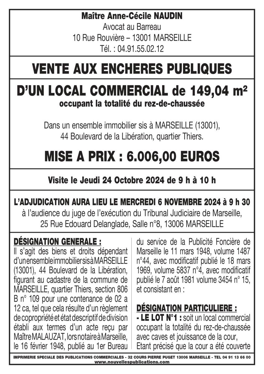 D’UN LOCAL COMMERCIAL de 149,04 m² occupant la totalité du rez-de-chaussée Dans un ensemble immobilier sis à MARSEILLE (13001), 44 Boulevard de la Libération, quartier Thiers. MISE A PRIX : 6.006,00 EUROS
