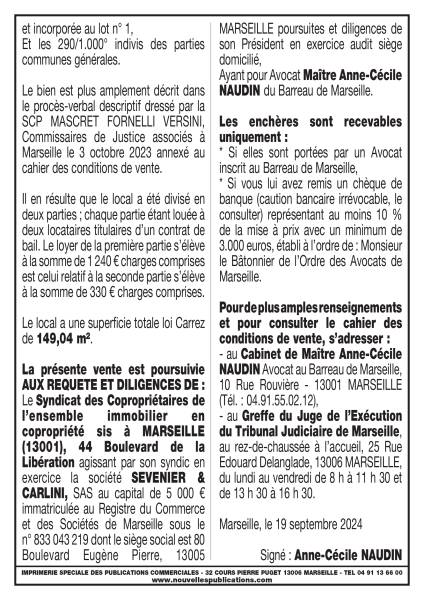 VENTE AUX ENCHERES DU 6/11/2024 LOCAL COMMERCIAL MARSEILLE