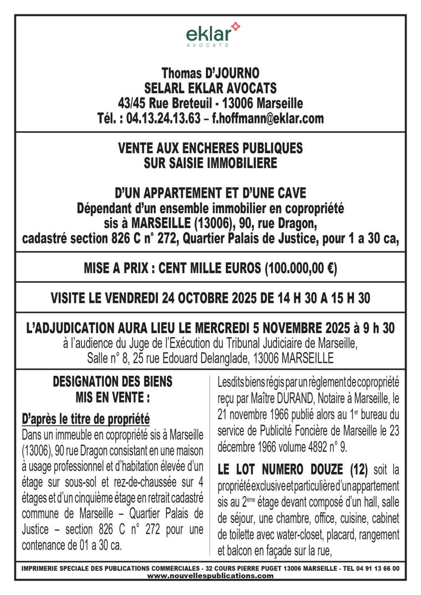 VENTE AUX ENCHERES PUBLIQUES SUR SAISIE IMMOBILIERE D’UN APPARTEMENT ET D’UNE CAVE Dépendant d’un ensemble immobilier en copropriété sis à MARSEILLE (13006), 90, rue Dragon, cadastré section 826 C n° 272, Quartier Palais de Justice, pour 1 a 30 ca,