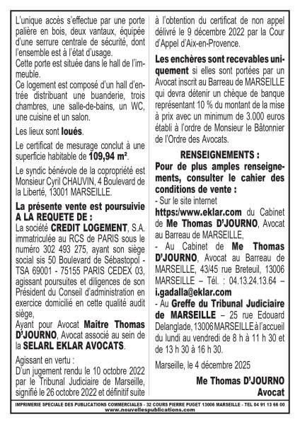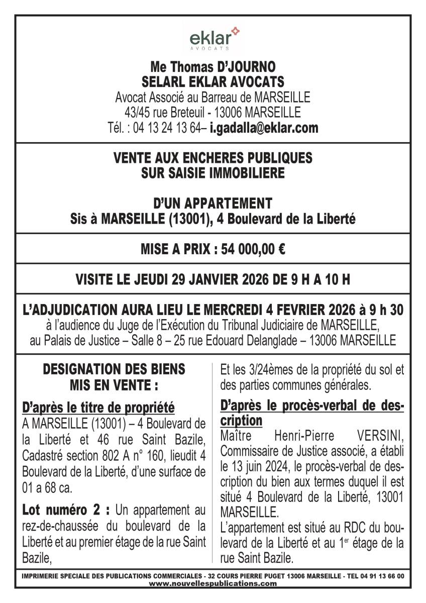 VENTE AUX ENCHERES PUBLIQUESSUR SAISIE IMMOBILIERED’UN APPARTEMENTSis à MARSEILLE (13001), 4 Boulevard de la Liberté