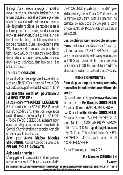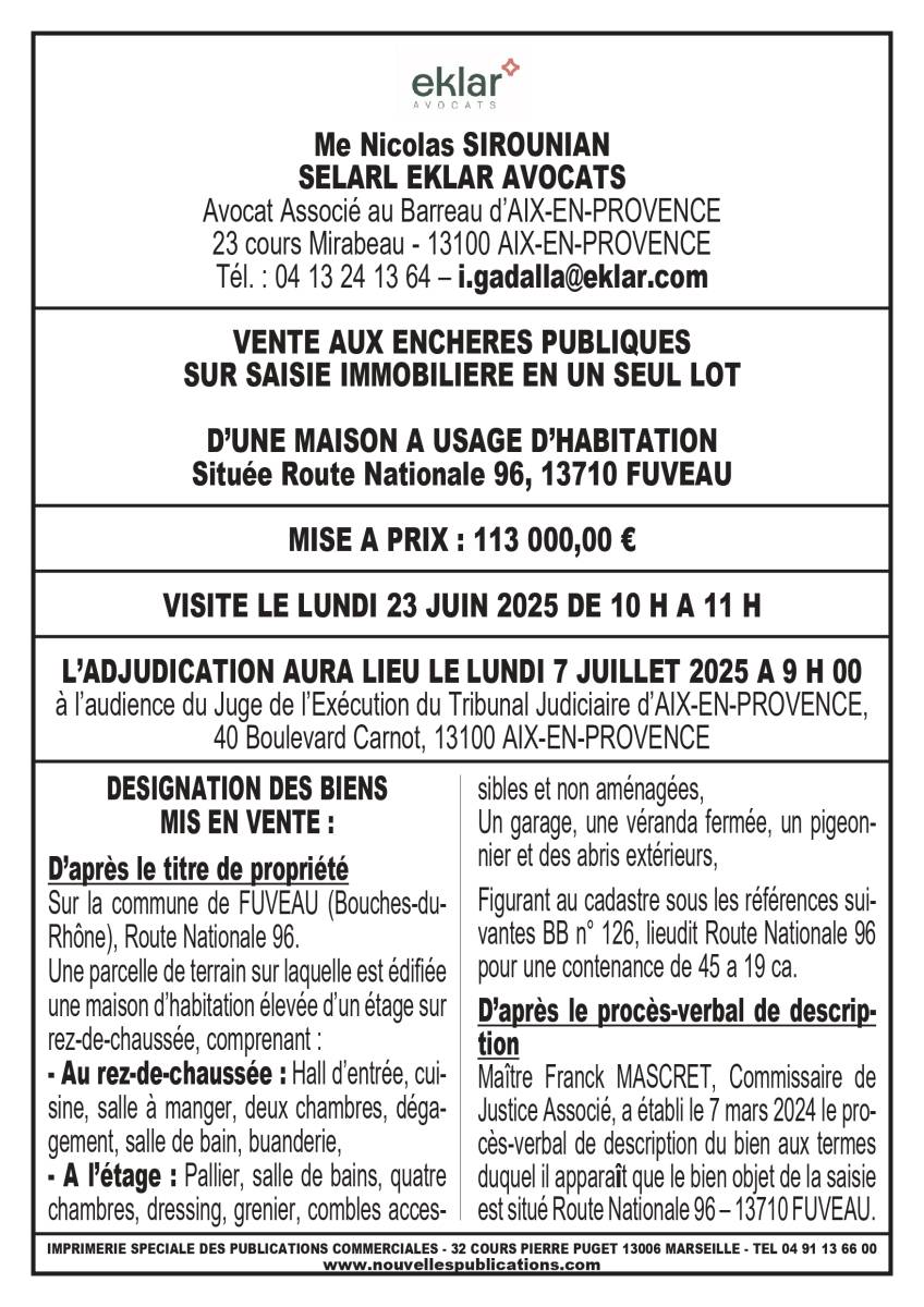 VENTE AUX ENCHERES PUBLIQUESSUR SAISIE IMMOBILIERE EN UN SEUL LOTD’UNE MAISON A USAGE D’HABITATIONSituée Route Nationale 96, 13710 FUVEAU