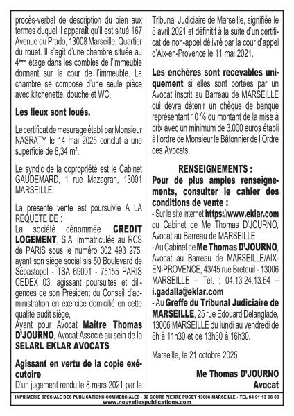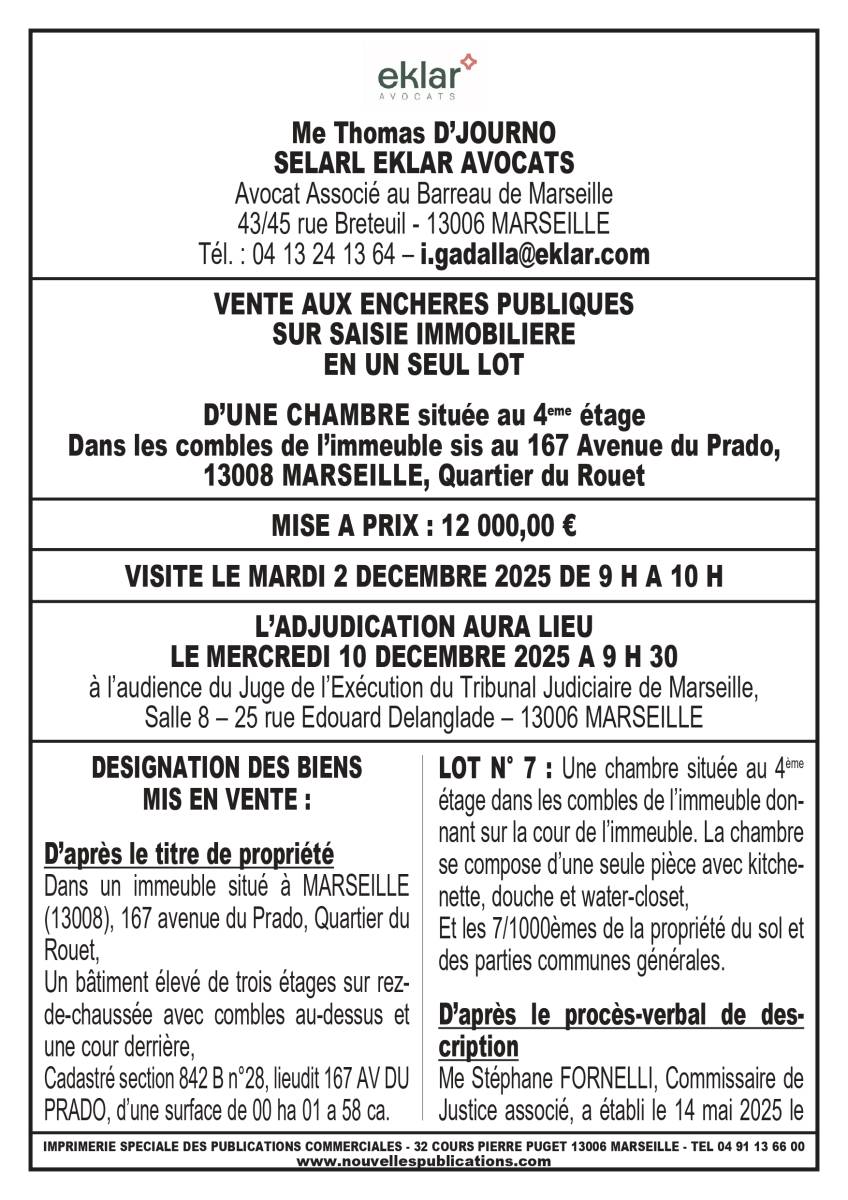 VENTE AUX ENCHERES SUR SAISIE IMMOBILIERE DU 10/12/2025 CHAMBRE 13008 MARSEILLE