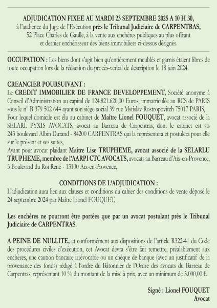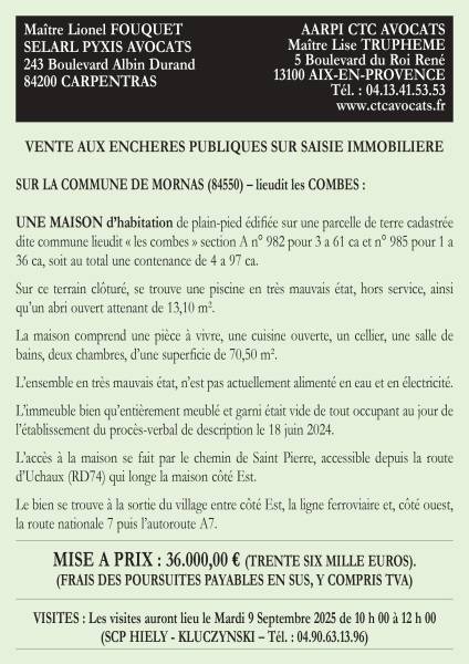 VENTE AUX ENCHERES SUR SAISIE IMMOBILIERE DU 23/09/2025 MAISON à MORNAS (84550)