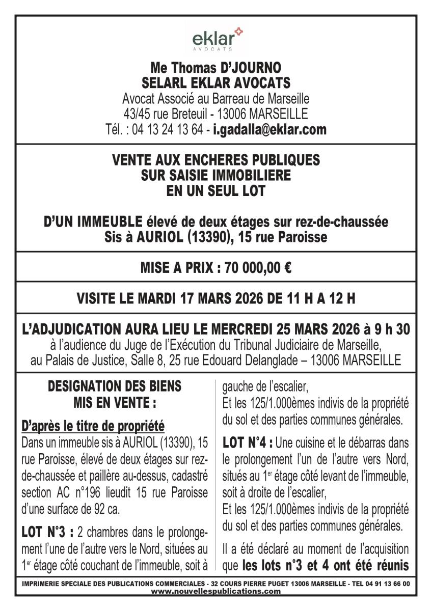 VENTE AUX ENCHERES PUBLIQUES SUR SAISIE IMMOBILIERE EN UN SEUL LOT D’UN IMMEUBLE élevé de deux étages sur rez-de-chaussée Sis à AURIOL (13390), 15 rue Paroisse