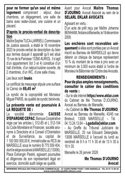 VENTE AUX ENCHERES SUR SAISIE IMMOBILIERE DU 25/03/2026 IMMEUBLE AURIOL 13390