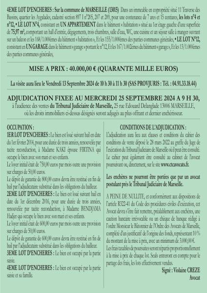 4 LOTS D’ENCHERES : sur la commune de MARSEILLE (13015) :